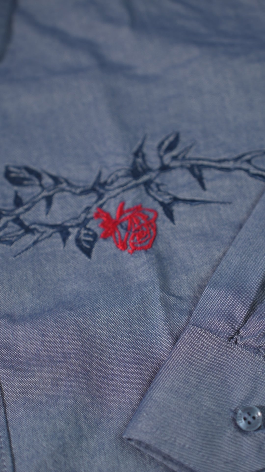 Thorn Serpent wraps strength in embroidery—where a serpent coils through a blooming rose on the back, and thorny veils brush across the chest like a quiet warning. For those who bloom with intent and bite.